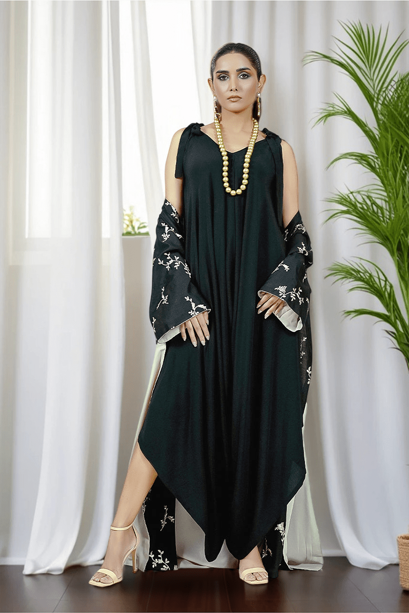 A timeless classic with a contemporary edge—this sleeveless black georgette jumpsuit is designed with simplicity and elegance. Light, fluid, and effortlessly flattering, it forms the perfect base for layering or wearing on its own. Paired with a beautifully crafted cotton net long cape , adorned with delicate floral embroidery and a contrasting inner lining, this ensemble blends modern minimalism with subtle artisanal charm.